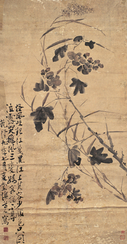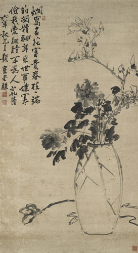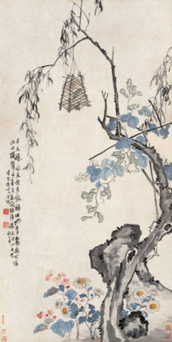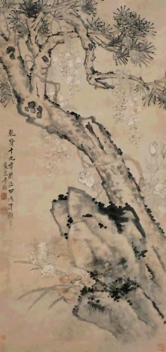 李鳝,1686年生,1762年逝世,江苏兴化人。清代书画家。鳝,一作觯,字宗扬,号复堂、懊道人。康熙五十年(1711)举人,曾为宫廷作画,后任滕县知县,为政清简,以忤大吏罢归。在扬州卖画。为扬州八怪之一。擅画花卉虫鸟,初师蒋廷锡,画法工致;又高师其佩,进而趋向粗笔写意,并取法林良,徐渭、朱耷,落笔劲健,纵横驰骋,不拘绳墨而有气势,有时使用重色或彩墨结合,颇得天趣。传世作品有《五松图》、《芭蕉萱石图》、《墨荷图》、《浴凫图》等。《梅兰竹图》简介 李鳝 立轴 纸本 墨笔 纵189.7厘米 横63.4厘米 上海博物馆藏 此画以墨彩写竹、梅、兰三君子。翠竹修长挺拔,竹叶纵横纷披。梅树盘根错节,造型奇特,似龙舞九天。幽兰则清雅绣逸,姿态飘摇。墨之浓淡相宜相辅,多以双钩纵笔勾出梅之枝干,浓墨点苔,圆笔写花,极富情趣。幽兰以浓墨写出,似有临风飘逸之姿。画面繁杂却有序不乱,构图大气豪放,笔势劲健自由,情趣天成。