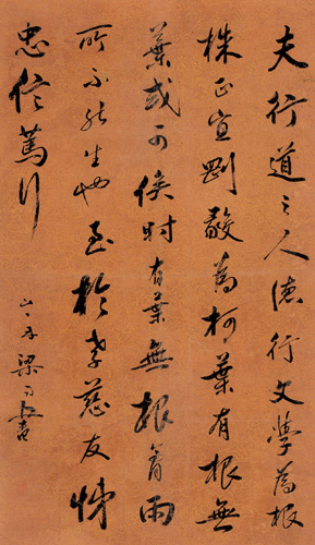 梁同书,1723年生,1815年逝世,钱塘(令浙江杭州)人。清代书家。字元颖,号山舟,晚号不翁,九十以后号新吾长翁。大学士梁诗正之子。乾隆举人,特赐进士,选庶居士、累迁侍讲;忧归不复出。工书法,出入颜、柳、米之间,晚年纯任自然,冠绝时流。诗多雅意,文亦清峭,故为书名所掩。卒之前数日,自书讣,苍劲如昔。新书碑版遍环宇,与刘石庵(墉)、王梦楼(文治)并称。年九十余,尚为人书碑文墓志,终日无倦容,并无苍老之气。著有《频罗庵遗集》、《频罗庵论书》等。传世书迹甚富,小楷书作尤多。《苏老泉文卷》,书于乾隆五十九(1794),时年72岁。纸本墨迹。纵33.4厘米,横571厘米。故宫博物院藏。梁同书博学多文,善鉴别。由他书写的碑刻和题写的不可胜数,负盛名60年。此件行书作品,其书不拘苏、米形迹,而得其神韵,貌丰骨劲,味厚神藏。其章法平稳,行距疏朗,用笔平和自然,都是承继赵孟頫、董其昌遗风的结果。此卷中字字提按顿挫交待清晰,技法精湛娴熟,看似寻常,无新奇惊人之处,然欲达到此也并非易事。王文治在书写时挥洒自如,将其功力与性情和谐统一于此作品中。此卷虽然不是梁同书最好的作品,但也能反映出他书艺水平的基本状况。